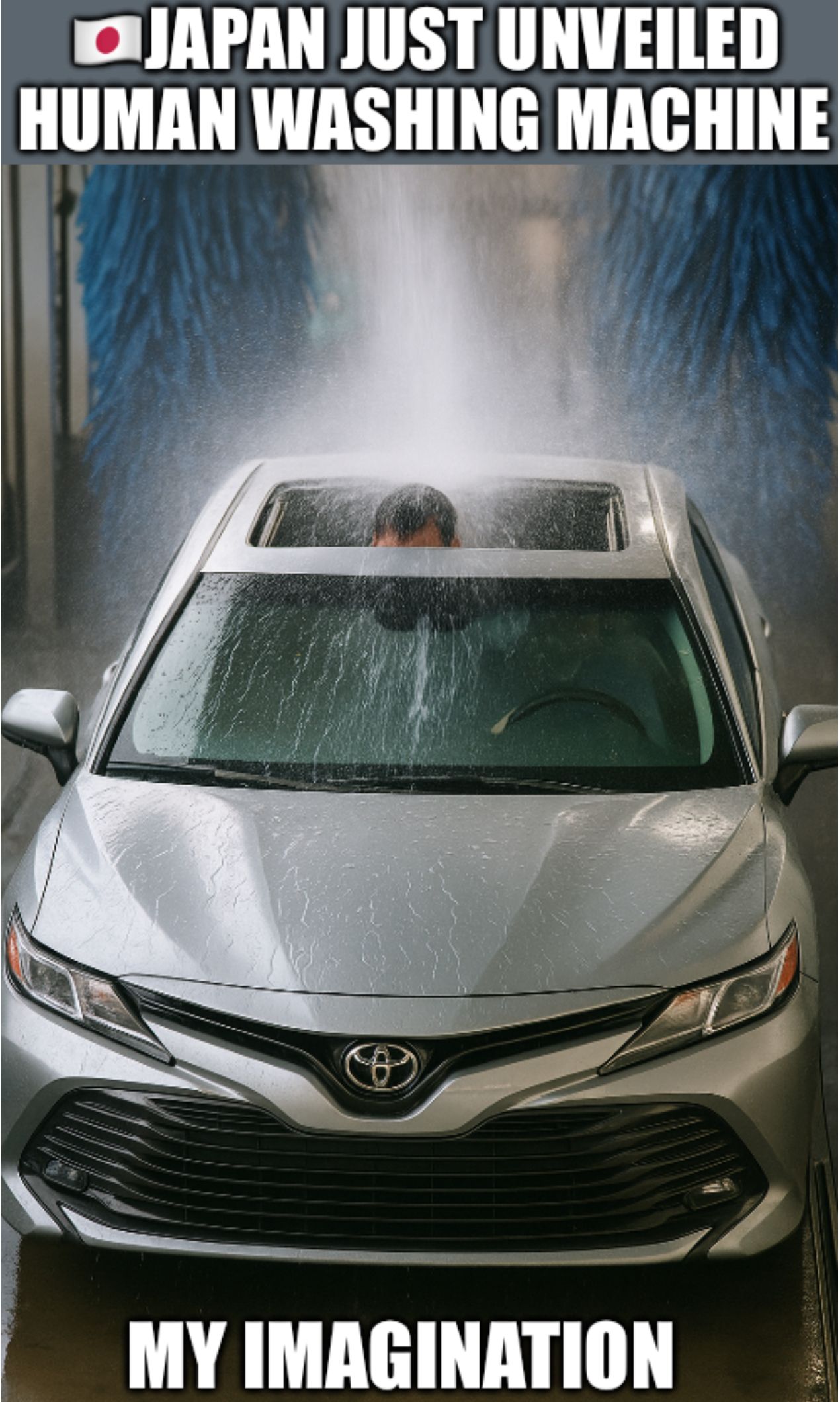 Beyond the meme, this is eldercare R&D. Japan's aging population and caregiver shortages make automated bathing systems serious business—this is robotic personal care wrapped in sci-fi.