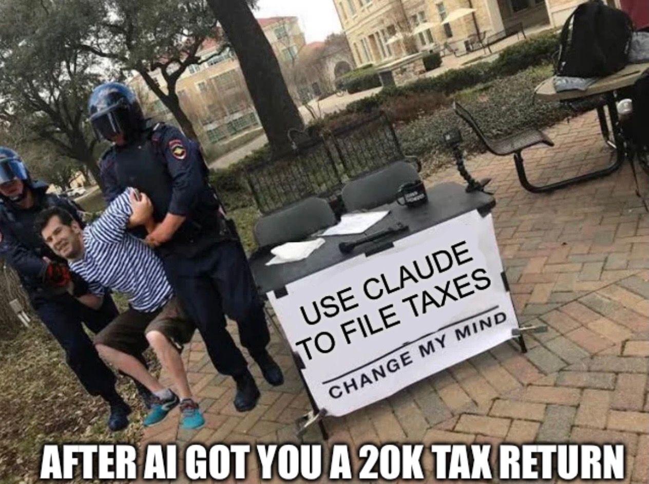 Jokes aside, it can be helpful. Check out this article - “I Used Claude Code to File My Taxes. Here’s Exactly How I Did It (And Got a $6,500 Refund).” by leopardracer